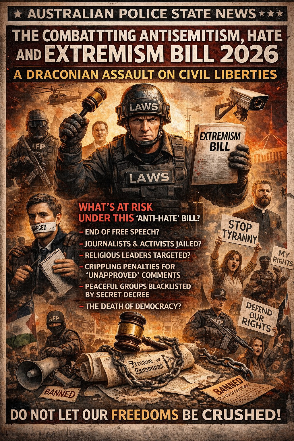 It stretches well beyond targeting neo-Nazis or violent extremists, casting a wide net that could easily ensnare ordinary citizens – activists, journalists, artists, clergy, even members of minority communities – who never imagined they’d be branded “extremists.” Below, we expose how this Bill’s ambiguous language, constitutional infirmities, unchecked executive powers, and dangerous breadth put every Australian’s civil liberties at risk.